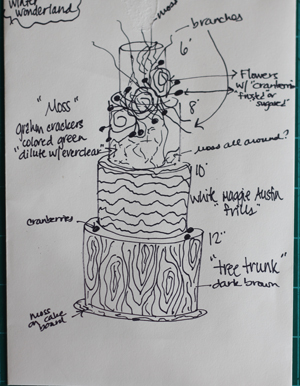 If I can visualize the cake in my head, then I typically do not sketch the cake. I write out a detailed design description for myself and the customer. If I just can’t seem to see the final cake in my head, I will sketch it. I just use a sketch pad, pencil, and colored pencils. This helps me visualize the cake, and then I will still write a detailed description of it. That way when I go to make the cake, if I have no idea what I just sketched, I can read about it. I think writing down the details of each cake helps me later on with a to-do list, shopping list, and setting a timeline. So I prefer to see the cake in writing, as well as have a general picture of it in my head moving forward.